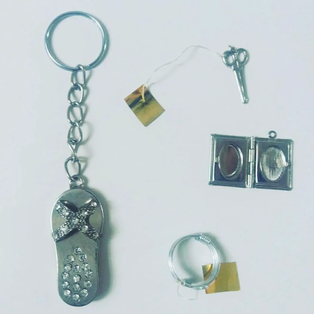 Lote de bijuterias. Pingentes, anel e chaveiro. Prateados. Novos.