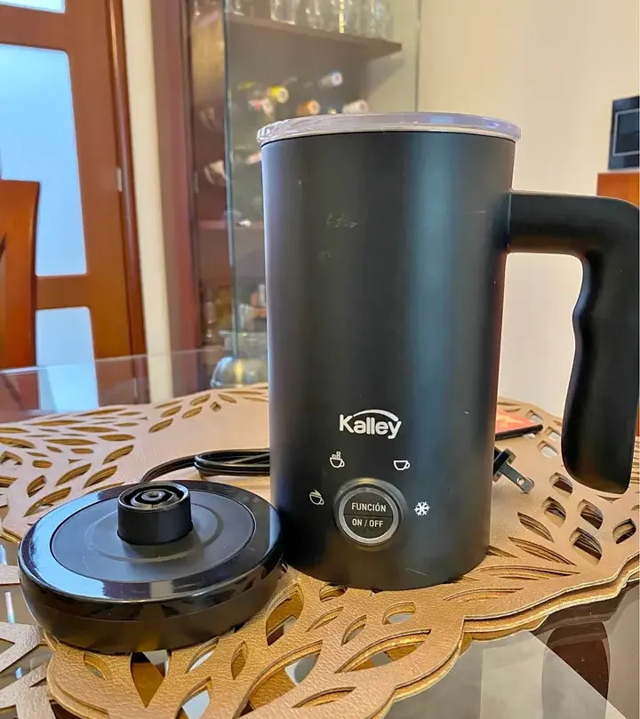 Espumador de leite elétrico da marca Kalley, cor preta, em bom estado. Acompanha base de apoio.