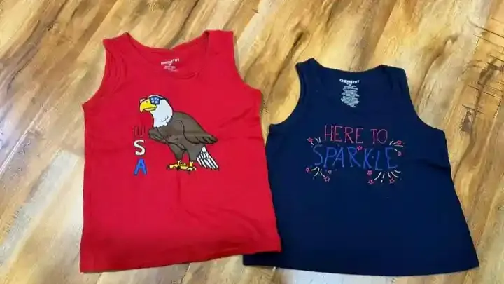 Duas regatas infantis em bom estado. Uma vermelha com estampa de águia e escrita 'USA', e outra azul marinho com a frase 'Here to sparkle' e desenhos de estrelas.