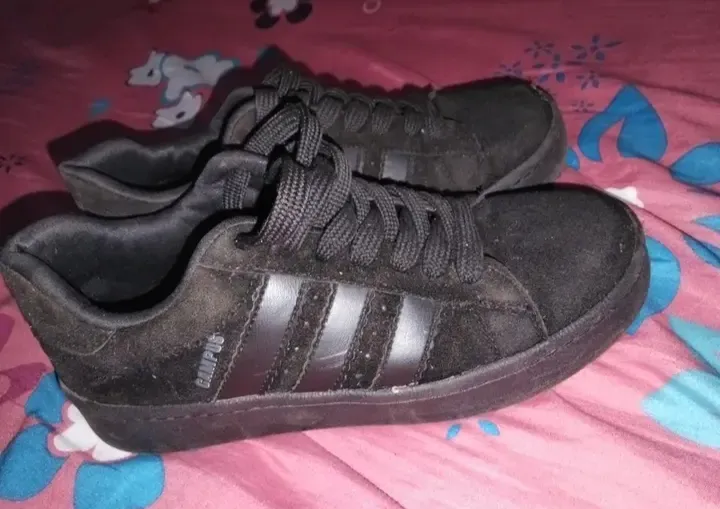 Tênis Adidas Campus, cor preta, em camurça e couro sintético. Usado, com pequenos sinais de uso.