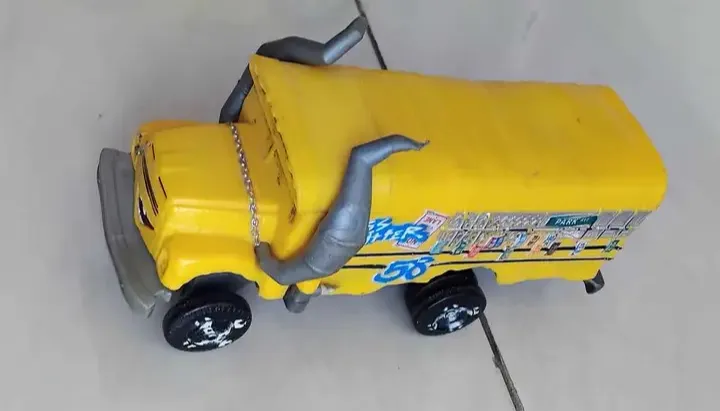 Caminhão amarelo artesanal com detalhes em cinza e adesivos. Apresenta desgastes nas rodas.