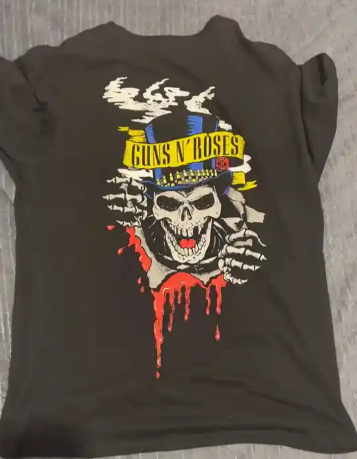 Camiseta preta com estampa de caveira com chapéu e logo Guns N' Roses. Usada, mas em bom estado.