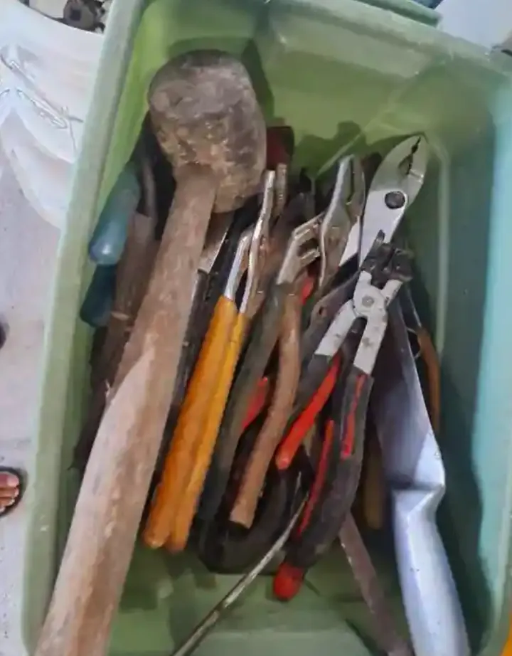 Conjunto de ferramentas diversas em bom estado geral. Inclui martelo de madeira, alicates de diferentes tipos e outras ferramentas manuais. Visíveis sinais de uso.
