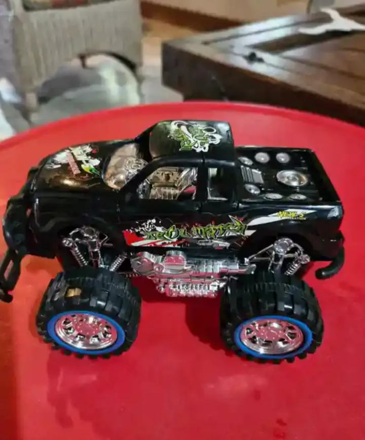 Caminhão Monster Truck de brinquedo, cor preta com detalhes prateados e desenhos coloridos. Pneus grandes e suspensão aparente.
