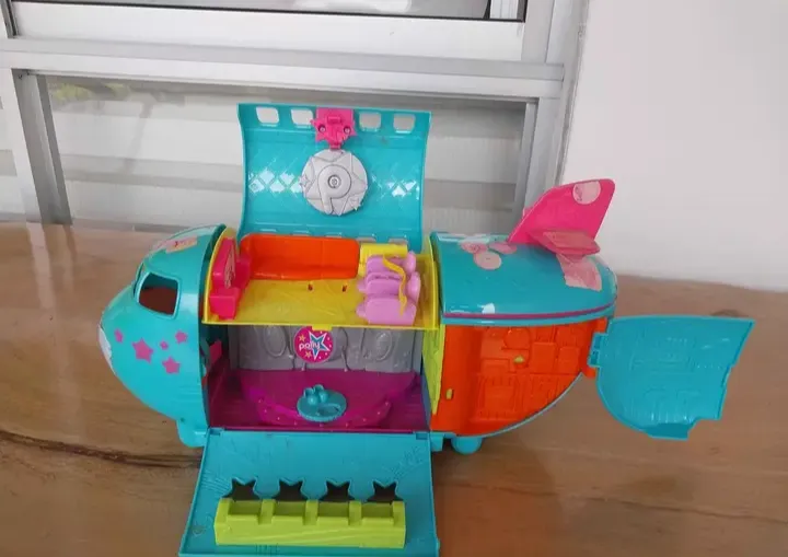 Miniatura de avião Polly Pocket, modelo Festa Pop, cor predominante azul turquesa com detalhes em rosa e laranja. Inclui acessórios internos.