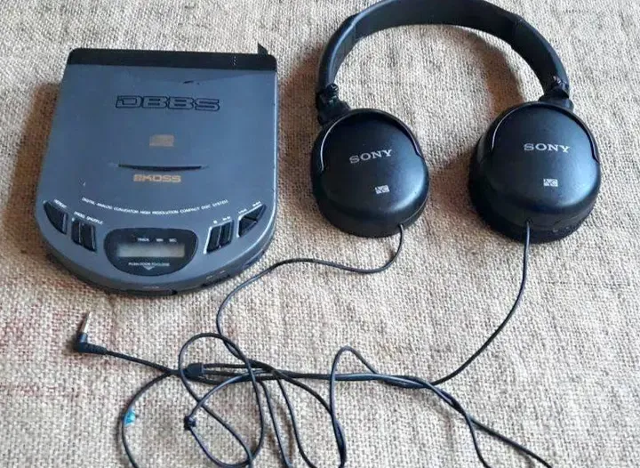 Aparelho de CD portátil Koss DBBS cinza com fone de ouvido Sony preto incluso. Aparelho em bom estado.