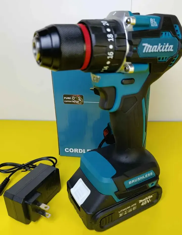 Parafusadeira/Furadeira da Makita, 48V, modelo Brushless (sem escovas). Cor predominante azul turquesa e preta. Acompanha carregador. Ideal para quem busca potência e durabilidade em suas ferramentas!
