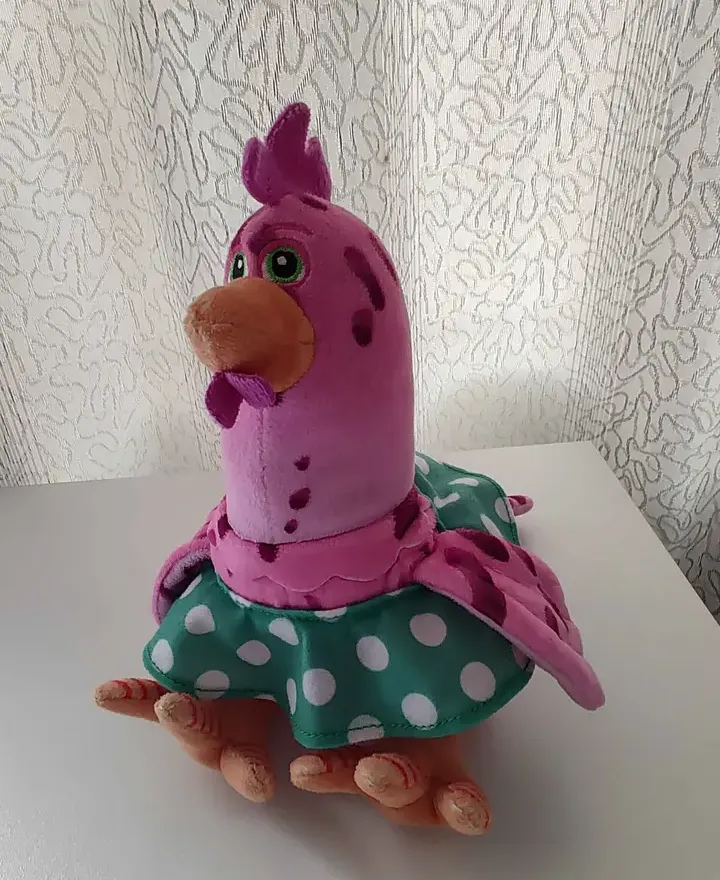 Linda galinha de pelúcia rosa, com detalhes em roxo e vestidinho verde de bolinhas. Em ótimo estado, pronta para um novo lar! Ideal para presentear ou decorar.