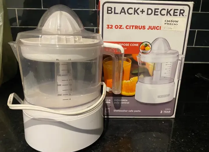 Espremedor elétrico de cítricos Black+Decker, modelo CJ650W. Jarra transparente com marcações de medida. Usado, em bom estado.