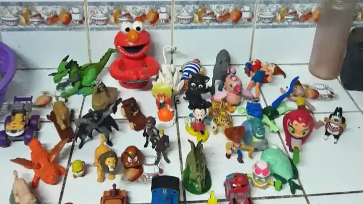 Coleção de miniaturas de personagens e veículos. Inclui figuras de Elmo, Batman, Mickey e outros, em plástico e PVC. Bom estado geral.