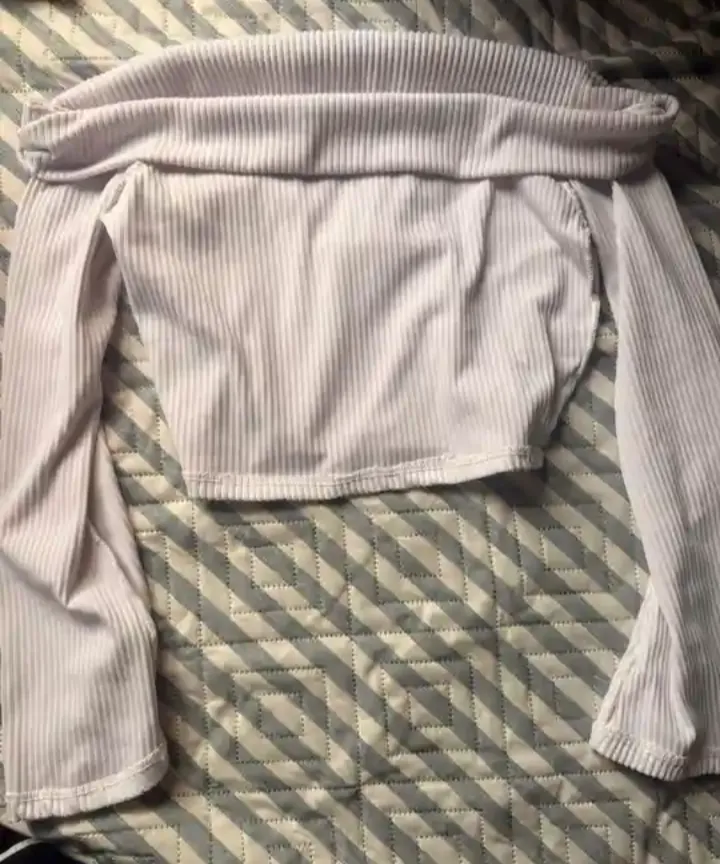 Blusa ciganinha lilás em tecido canelado, com mangas compridas e modelagem cropped. Em bom estado.