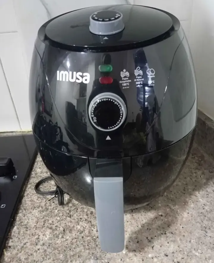 Fritadeira elétrica Imusa, cor preta, usada e em bom estado. Possui design compacto e painel com botões para temperatura e tempo.