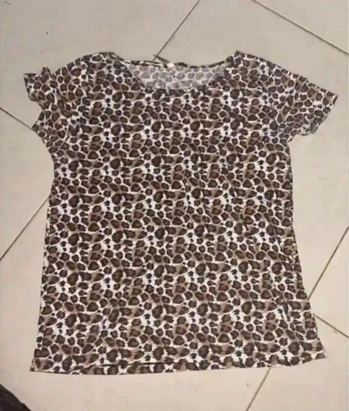Camiseta de manga curta com estampa de oncinha em tons de marrom e bege. Bom estado.