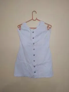 Vestido jeans branco, sem mangas, com fechamento frontal por botões prateados. Tamanho 40. Em bom estado.