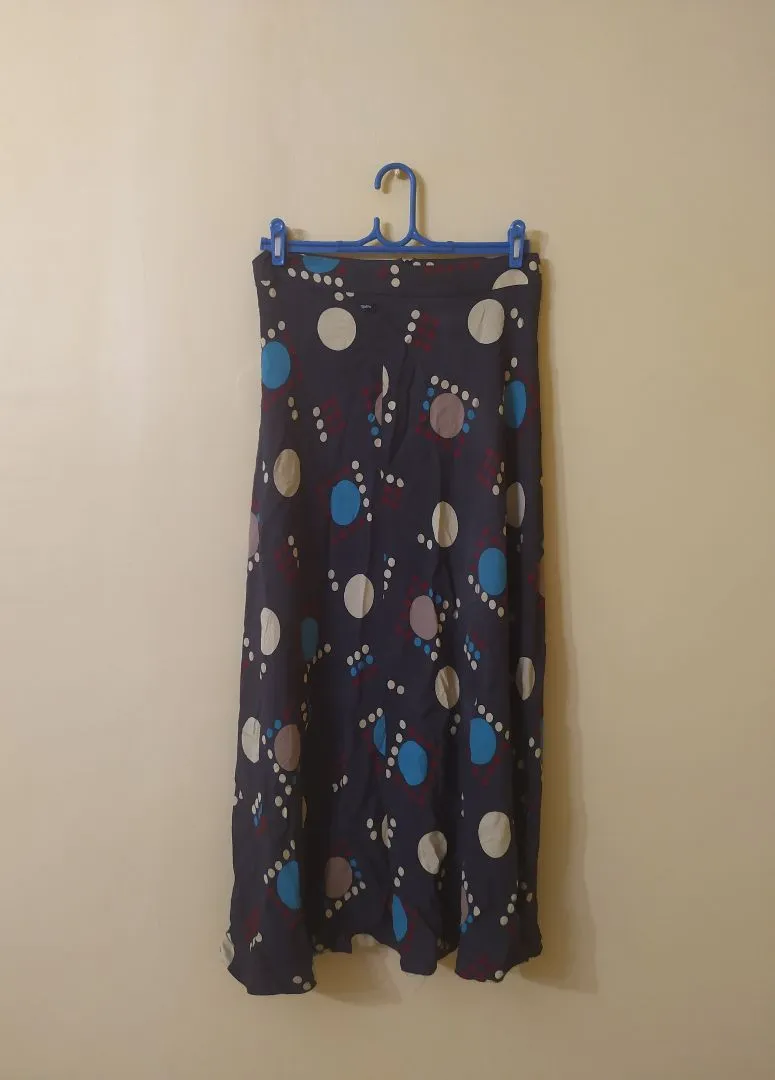 Saia comprida em tecido azul marinho com estampa. Tamanho 40.