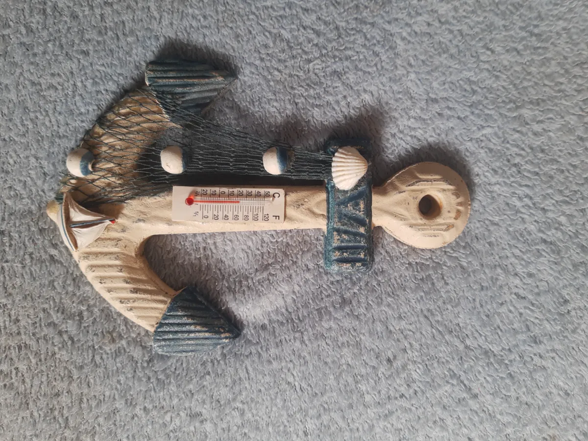 Charmoso termômetro em formato de âncora, com detalhes em madeira e motivos náuticos. Possui termômetro funcional embutido. Perfeito para decoração de ambientes com tema marítimo. Em ótimo estado.