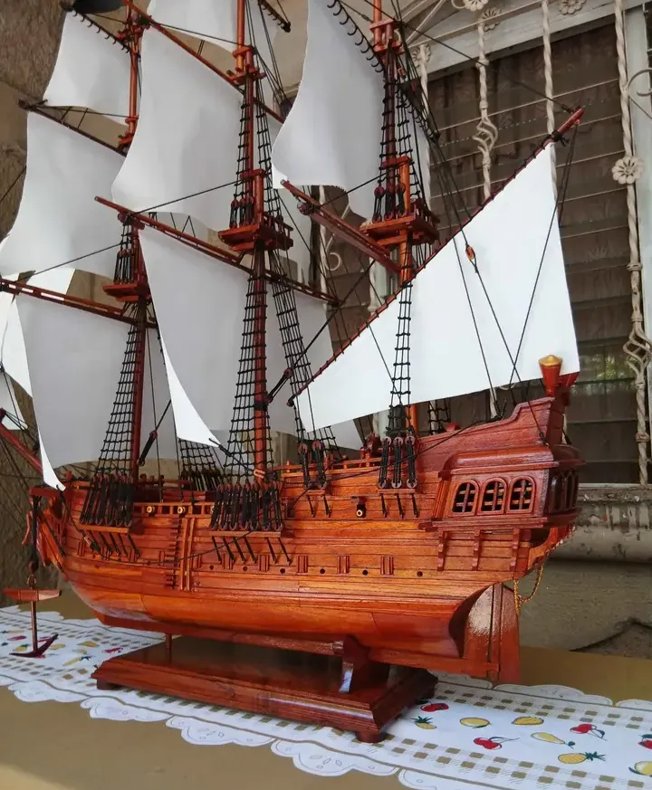 Linda réplica detalhada de um Galeão Espanhol, feita em madeira maciça e em excelente estado de conservação. Ideal para decoração ou colecionadores. Dimensões aproximadas: 60cm de comprimento, 50cm de altura e 20cm de largura.