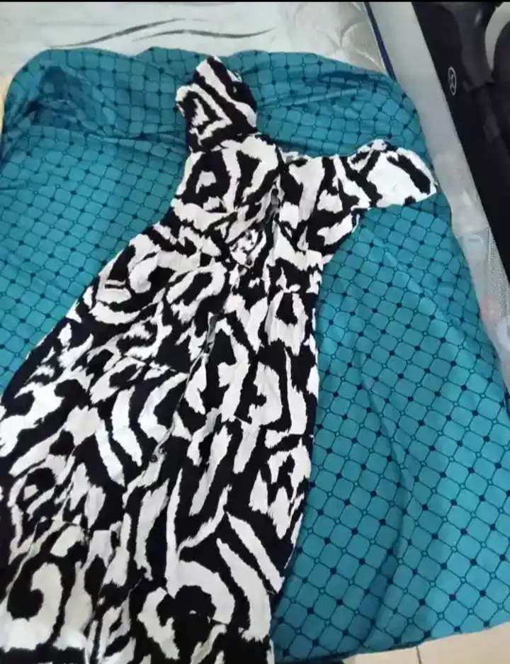 Vestido longo com estampa em preto e branco estilo zebra. Possui botões frontais e mangas curtas. Em bom estado.