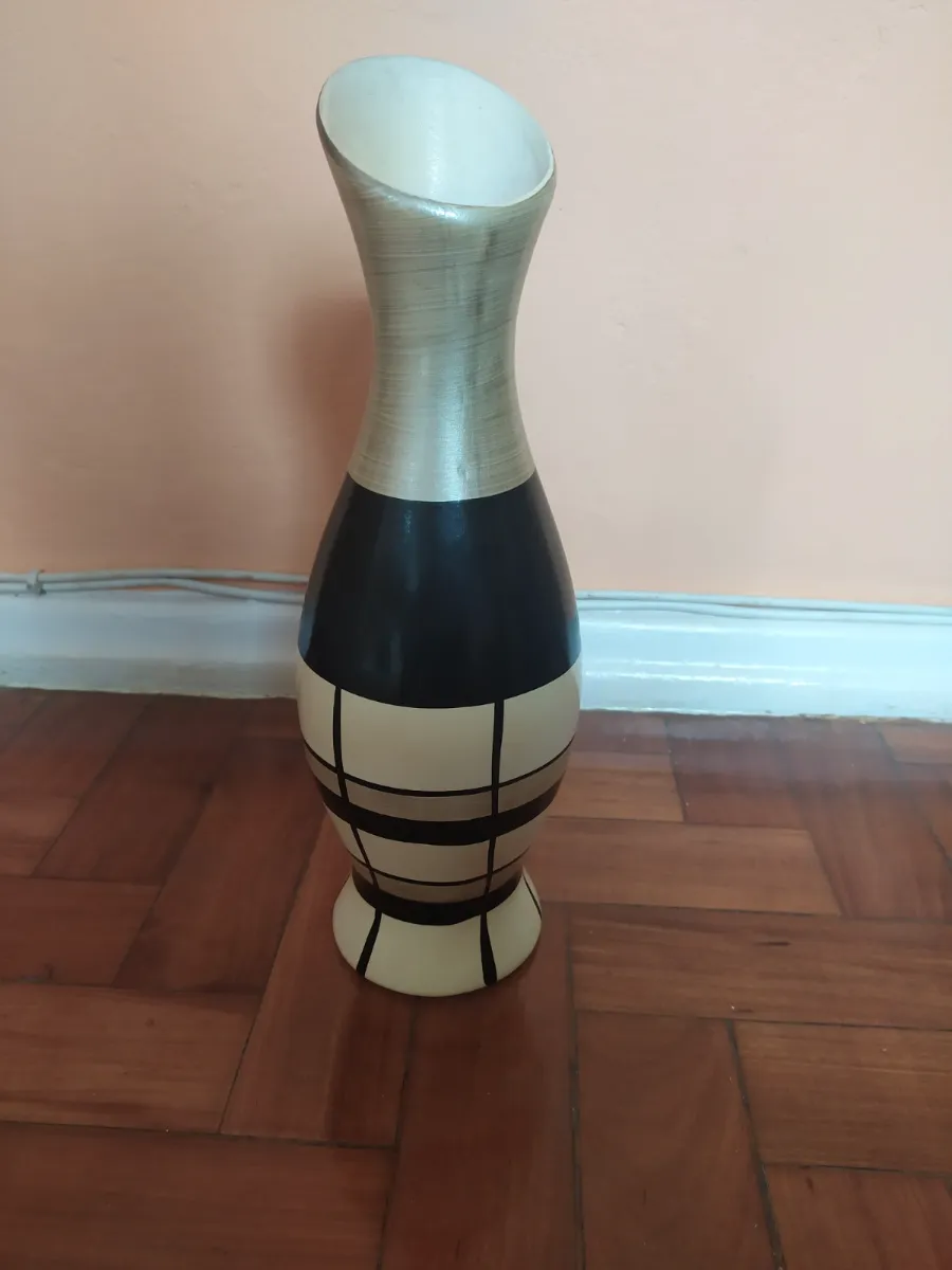 Jarro de cerâmica preto, branco e prata