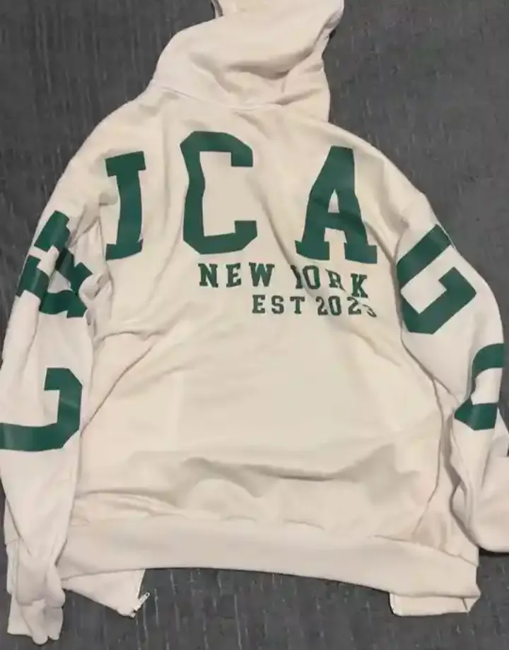 Moletom branco com capuz, estampa ICA New York EST 2023 em verde nas costas e mangas. Usado, em bom estado.