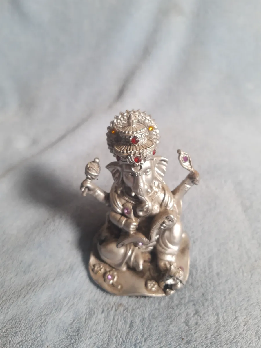 Linda estatueta de Ganesha em metal prateado, adornada com pedras coloridas. Em bom estado, perfeita para colecionadores ou para decorar seu lar com um toque de espiritualidade e beleza.