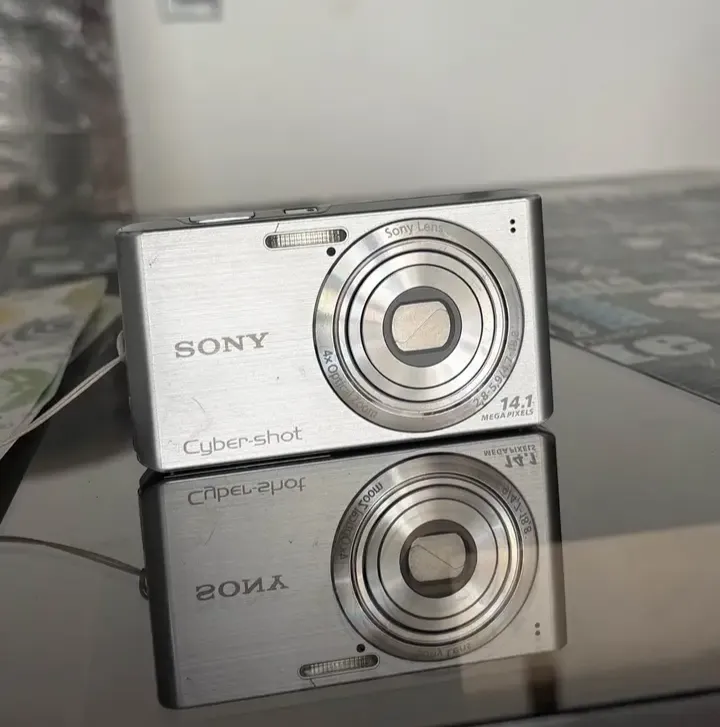 Câmera digital compacta Sony Cyber-shot em cor prata. 14.1 Megapixels, zoom óptico de 4x. Ideal para fotos do dia a dia. Usada, com marcas de uso, mas funcionando perfeitamente.