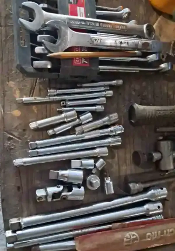 Conjunto de chaves fixas e soquetes com extensões. Possuem marcas de uso, mas em bom estado geral.