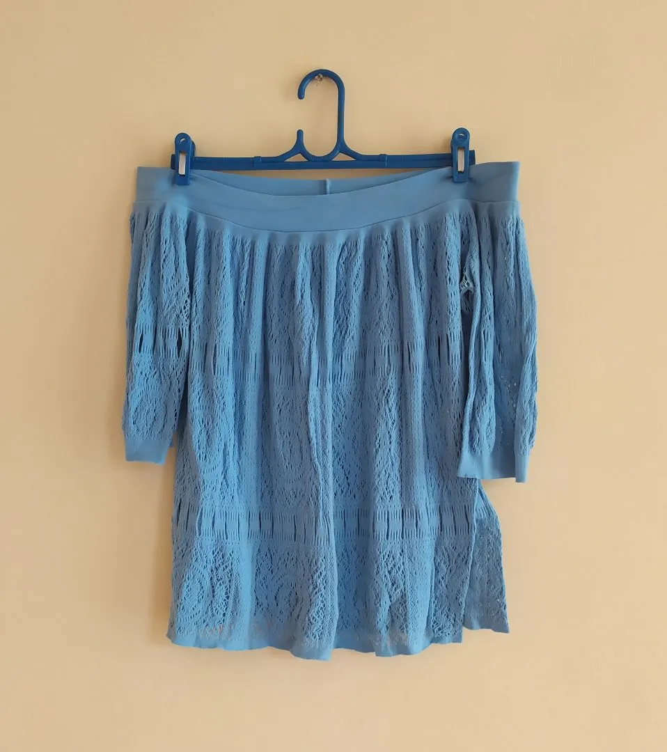 Blusa azul clara, com mangas 3/4 e decote ombro a ombro. Apresenta detalhes vazados na trama. Em bom estado.