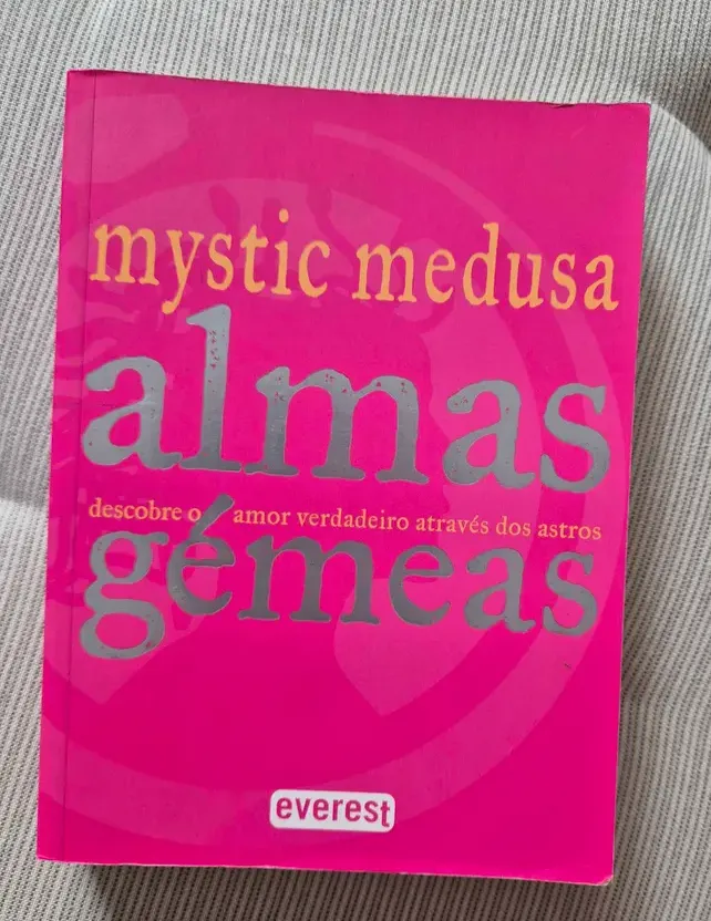 Livro em bom estado de conservação, capa rosa vibrante com título "Mystic Medusa Almas Gêmeas". Descubra o amor verdadeiro através dos astros! Editora Everest.