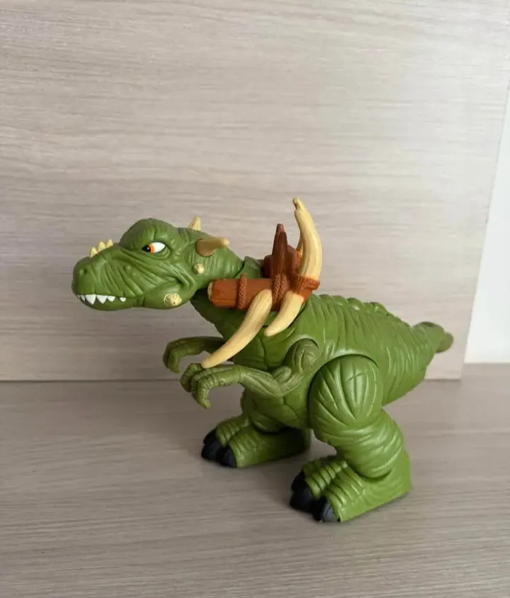 Boneco de dinossauro Tiranossauro Rex verde com detalhes em preto e armadura marrom com chifres bege. Usado em bom estado.