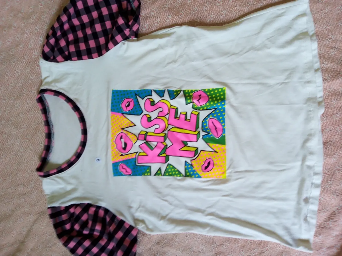 Blusa branca com estampa vibrante "Kiss Me" em estilo pop art, mangas curtas em tecido xadrez rosa e preto. Em ótimo estado, perfeita para um look divertido e estiloso.