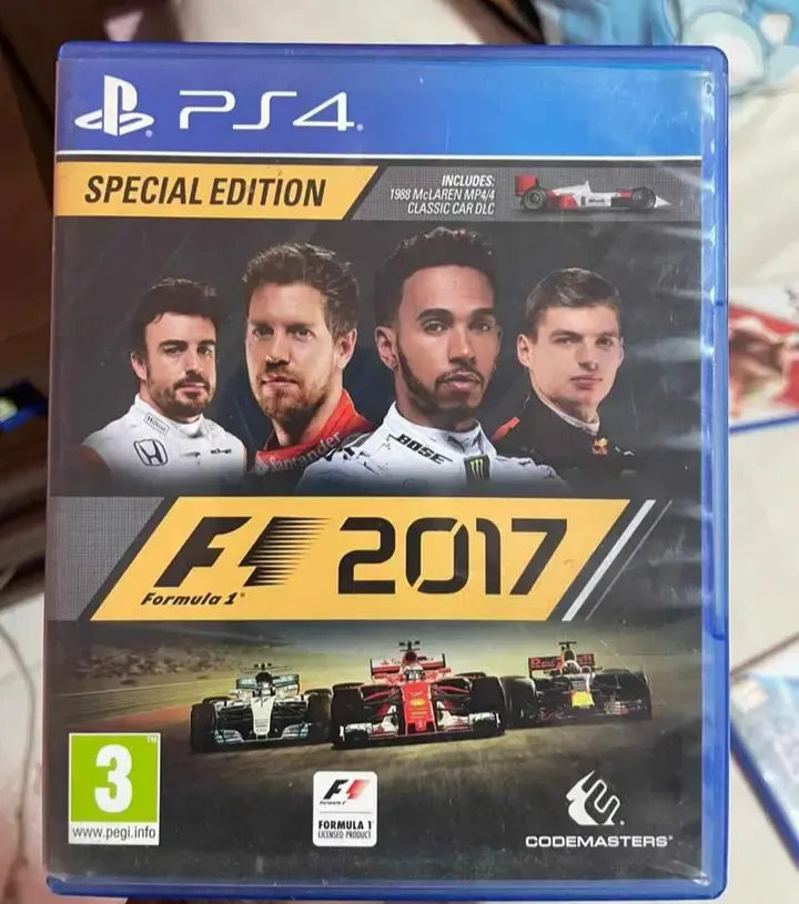 Jogo F1 2017 para PS4, edição especial com DLC do McLaren MP4/4 clássico. Capa em bom estado, com Fernando Alonso, Valtteri Bottas, Lewis Hamilton e Max Verstappen. Para fãs de Fórmula 1!