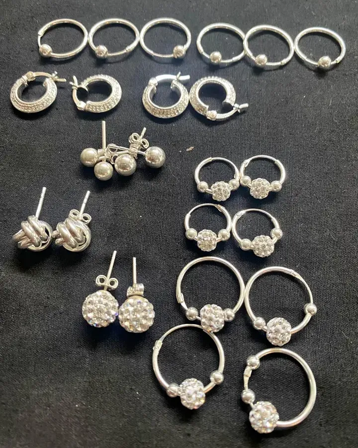 Conjunto variado de brincos em prata, incluindo modelos de argola, bolinha e com strass. Todos em bom estado, perfeitos para quem busca renovar sua coleção de acessórios.
