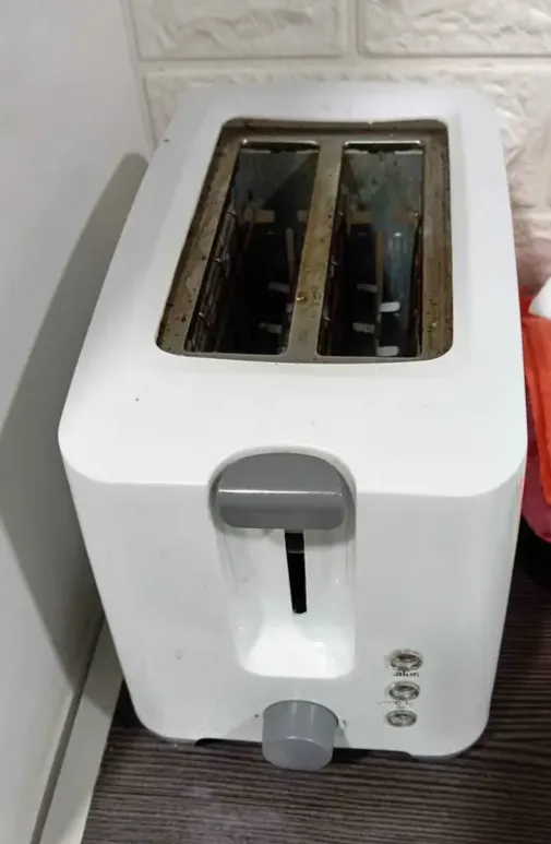 Torradeira branca, para duas fatias. Possui regulagem de temperatura e botões de funções. Apresenta marcas de uso.