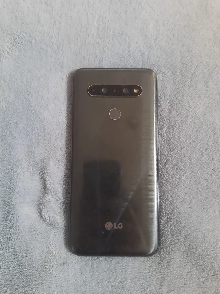 Celular LG em bom estado, cor escura. Câmera quádrupla e leitor de digital. Ideal para quem busca um smartphone funcional.