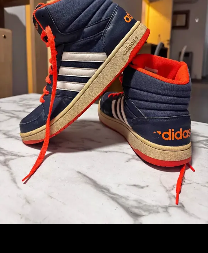 Tênis Adidas cano alto em bom estado. Cor azul marinho com detalhes em branco e laranja. Ideal para uso casual e estiloso.