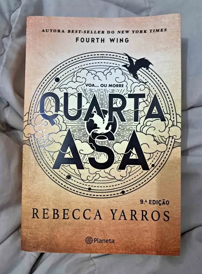 Livro 'Quarta Asa' de Rebecca Yarros, 9ª edição. Capa em ótimo estado, detalhes em dourado. Uma leitura emocionante!