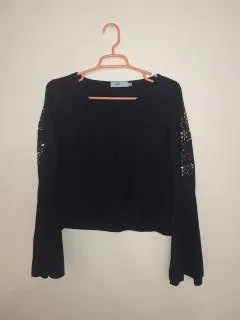 Blusa preta de manga longa, com detalhes em metais nas mangas. Aveludada. Tamanho P. Nova.