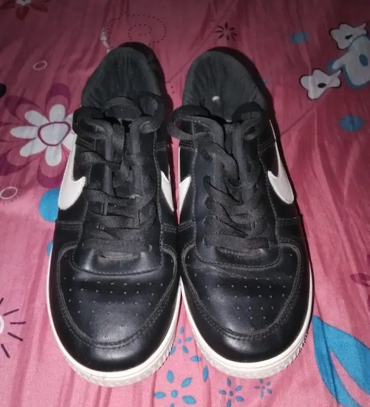 Tênis Nike Air Force 1, cor preta com detalhes brancos. Usado, porém em bom estado geral. Solado branco.