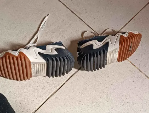 Par de tênis Converse Run Star Motion, cor predominante azul escuro com detalhes em branco e sola marrom. Usado, em bom estado.
