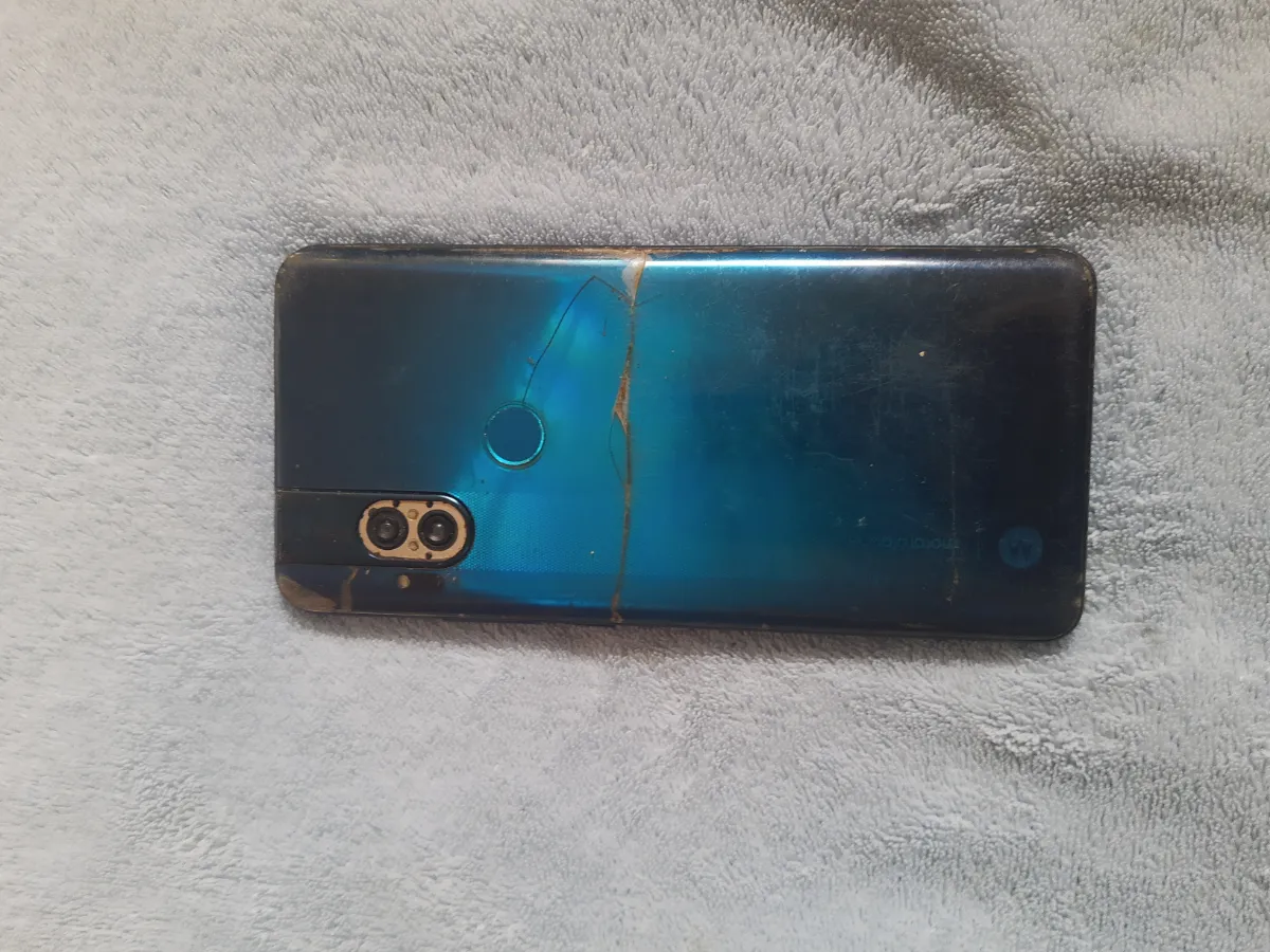 Smartphone Motorola com a traseira azul degradê. Apresenta trincos na parte de trás, conforme fotos. Ideal para quem precisa de peças ou para conserto. Funcionando