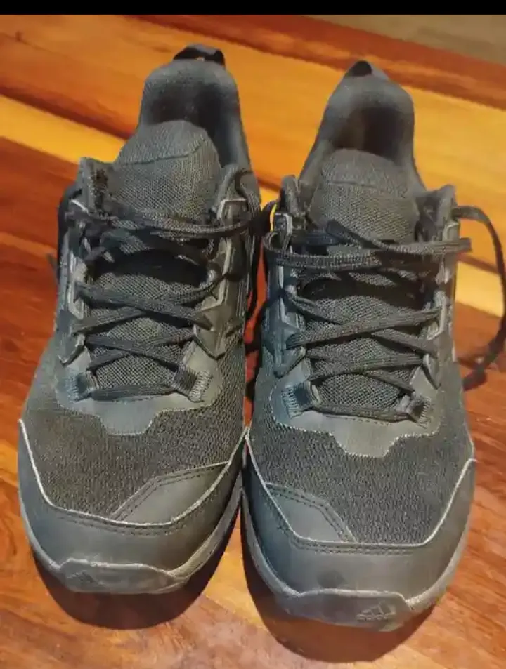 Tênis Adidas preto em bom estado, ideal para atividades ao ar livre ou uso casual. Confortável e estiloso, perfeito para quem busca um calçado versátil. Possui detalhes em mesh e solado resistente. Pequenos sinais de uso.e