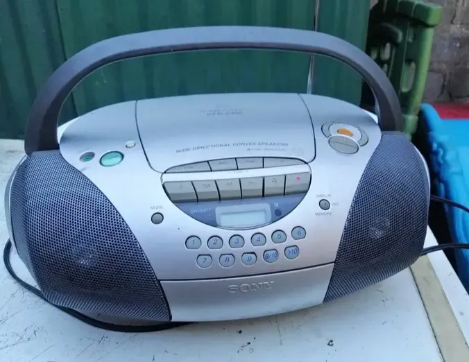 Rádio CD player Sony CFD-S300 na cor prata. Usado, mas em bom estado de conservação e funcionando perfeitamente. Ideal para quem busca um som potente e portátil. Possui rádio AM/FM e toca fitas.