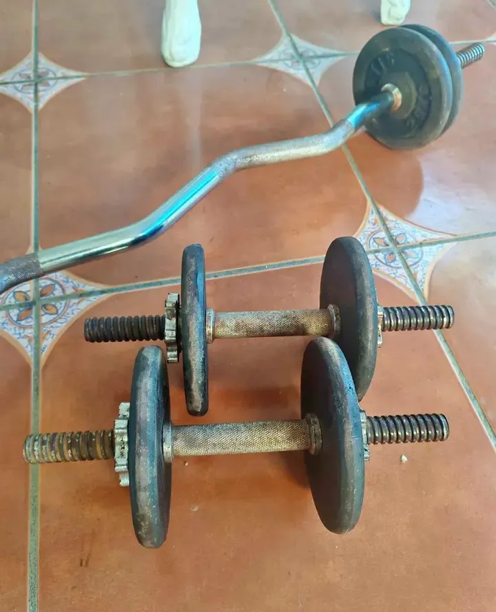 Kit de musculação usado, ideal para iniciantes! Inclui 1 barra curvada e 2 halteres com presilhas. Possuem marcas de uso, mas totalmente funcionais. Ótimo para começar seus treinos!