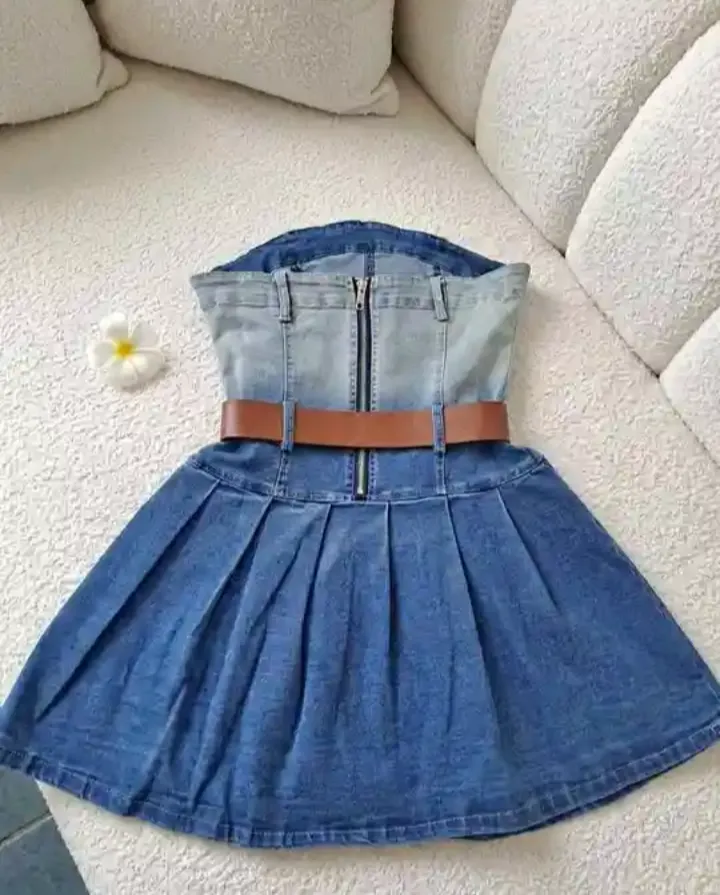 Vestido jeans, sem alças, com cinto marrom e zíper frontal. A saia é plissada e o tecido em bom estado.