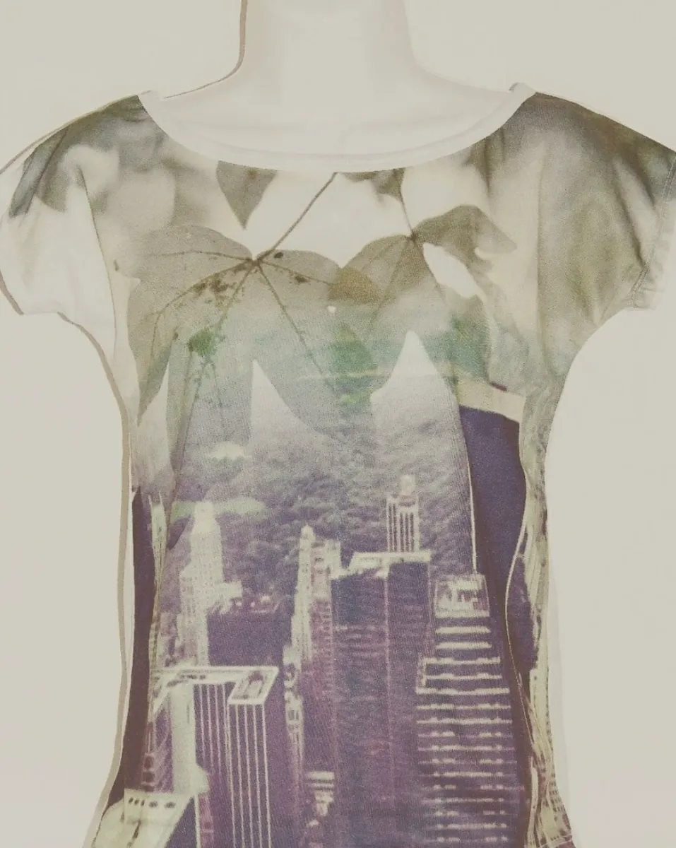 Troco esta blusa feminina. Modelo baby look, com estampa de cidade e folhas, com maguinha curtinha e bem fresquinha para usar no verão. Nova. Era da minha lojinha. Analisarei com carinho tua proposta de troca. Me chama inbox!