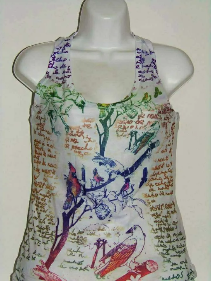 Regata colorida com estampa de pássaros. Tecido leve, bem fresquinha. Nova. Tamanho P.