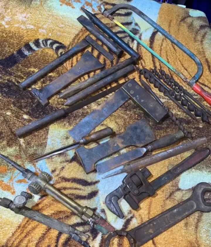 Lote variado de ferramentas antigas em bom estado geral, ideais para restauração ou uso. Inclui chaves, serras, brocas, talhadeiras e maçarico de solda. Algumas com sinais de ferrugem superficial, mas todas funcionais.
