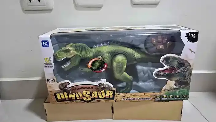 Dinossauro T-Rex de brinquedo com controle remoto. Novo, na caixa original. Cor verde vibrante, com detalhes realistas. Ideal para crianças a partir de 3 anos.