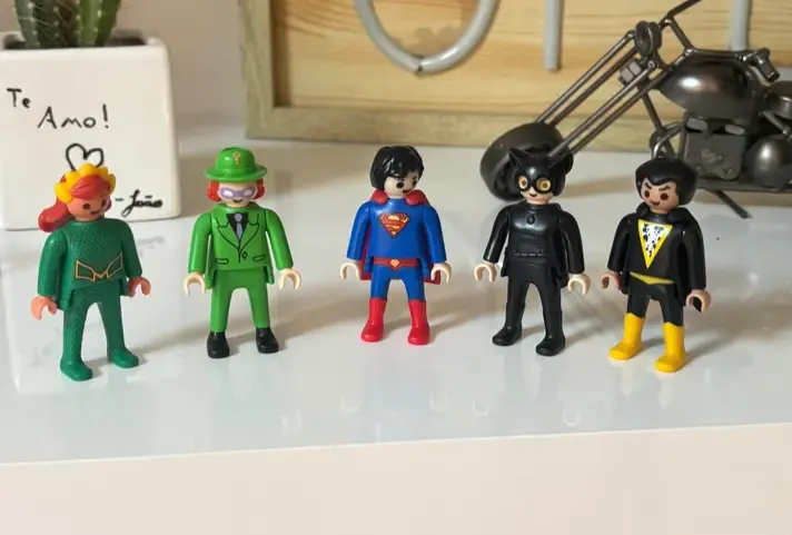 Conjunto de 5 bonecos Playmobil de super heróis e vilões. Inclui Hera Venenosa, Charada, Superman, Mulher Gato e Adão Negro. Figuras em bom estado, cores vibrantes.